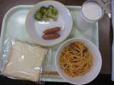 今日の献立は、減量食パン、牛乳、夏野菜スパゲッティ、ウインナー、枝豆サラダです...