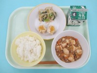 今日の給食は、ごはん、牛乳、にんじんシューマイ、塩ナムル、マーボー豆腐です。