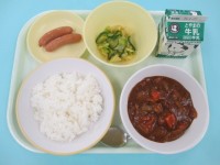 今日の給食は、ごはん、牛乳、ハヤシライス、あらびきウインナー、グリーンサラダで...