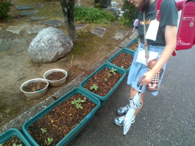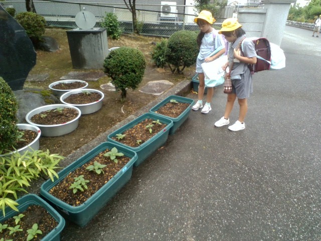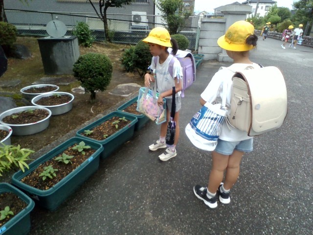 学校に着いてすぐ、ひまわりのプランターへ歩み寄る子供たちがいました。