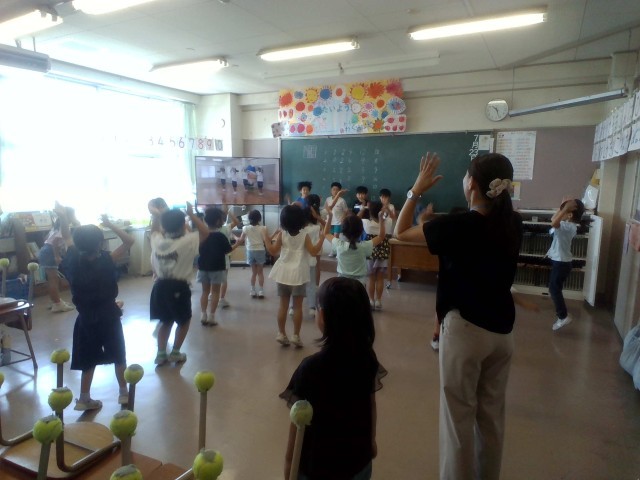 1年生の子供たちは、教室できときと夢体操を元気いっぱい踊っていました。
