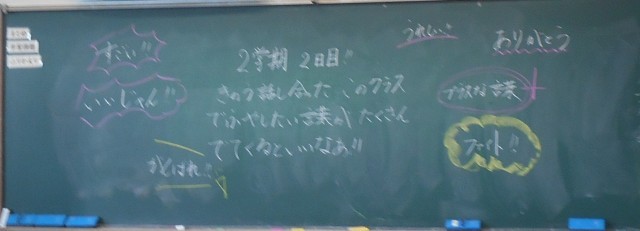 朝、5年生教室の黒板に書かれていたメッセージ。