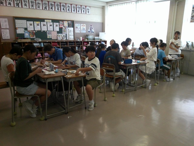 6年生は、折り紙を折って切って、自分で考えた紋様を工作しました。