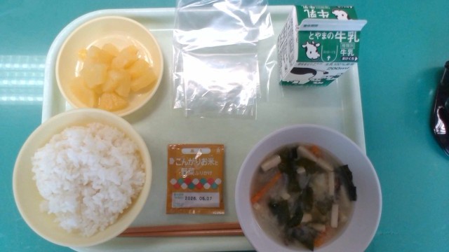 今日は、9月1日の「防災の日」にちなんだ献立です。常温で保存可能な食品を使った献立です。セルフおにぎりは、ビニル袋にごはんとふりかけを入れ、自分でにぎって食べます。ご家庭でも災害時には食事をどうするのかなど、話し合ってみてください。