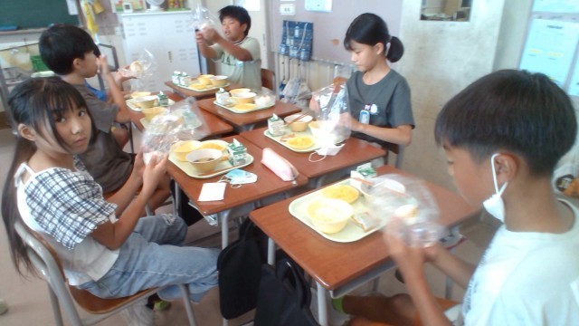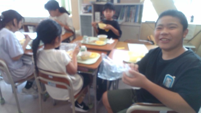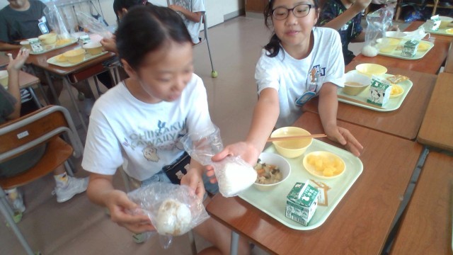 防災献立で、セルフおにぎりがでました。みんな三角おにぎりをつくろうと一生懸命に握っていました。自分たちで握ったおにぎりを食べて満足そうな子供たちでした。