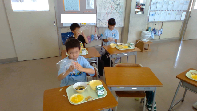 自分で袋にふりかけを入れて、おにぎりを作って食べました。