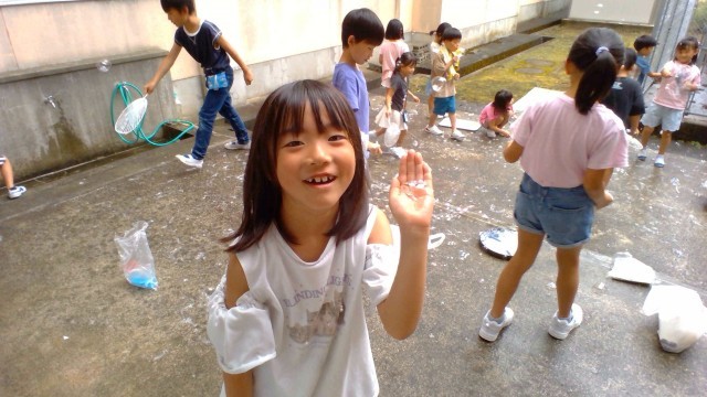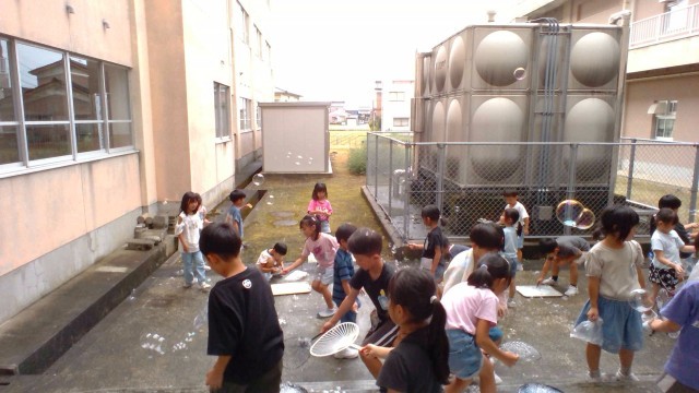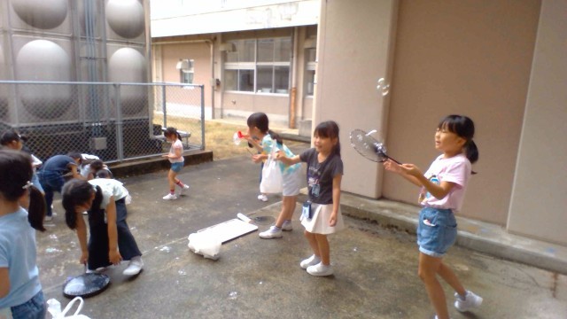 雨が止んだので、2回目のしゃぼん玉遊びをしました。今回は、しゃぼんだま遊びだけでなく、準備・片付け・振り返りまで1時間で自分たちで進んで活動していました。とても見ていて気持ちがよく、素晴らしい姿でした。