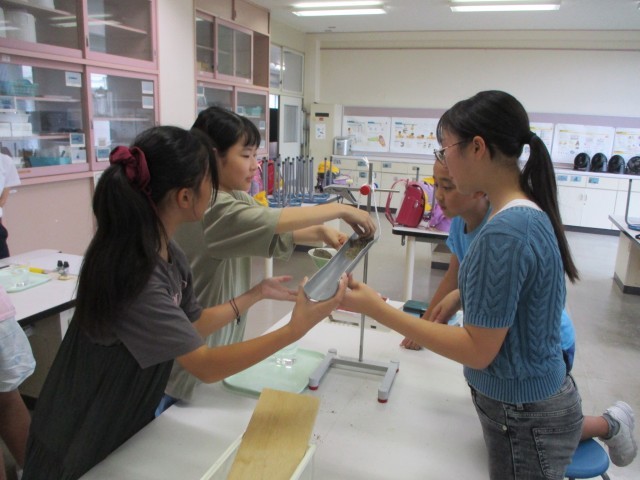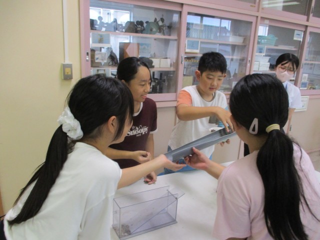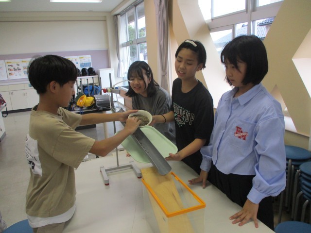 今日は、実験装置を使って実際に土と水を流し、地層ができる様子を観察しました。
