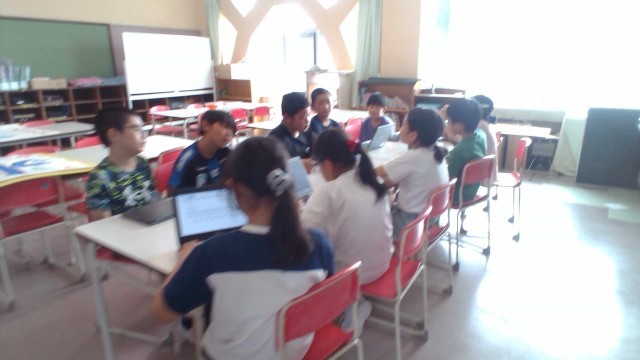 各チームに分かれて、学習発表会で発表する内容の構成を考えています。