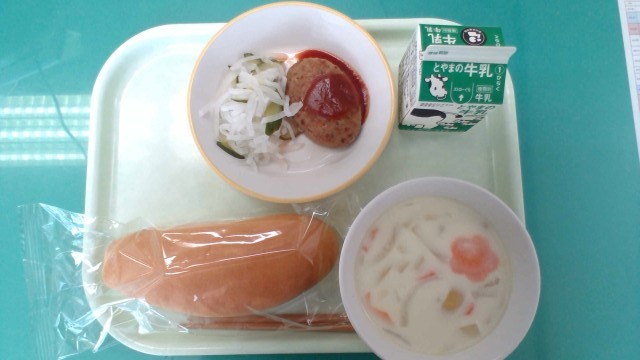 ・コッペパン ・牛乳 ・ハンバーグのケチャップかけ