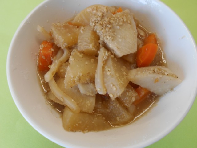 鶏肉と里芋のごま煮では、里芋と大根に味が十分にしみ込んでいました。
