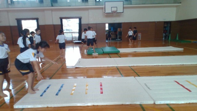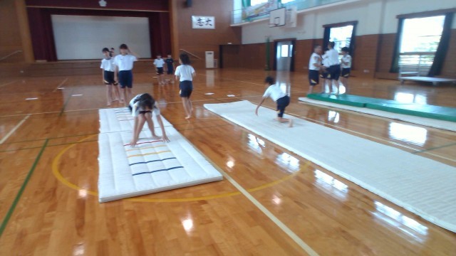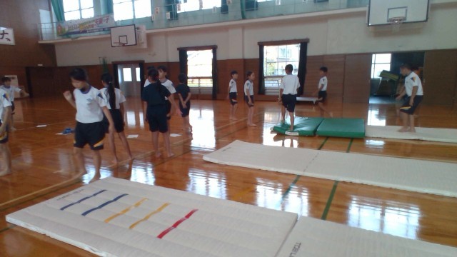 友達と見合いながら、自分たちの動きを確認しています。美しい動きになるように一生懸命練習しています。