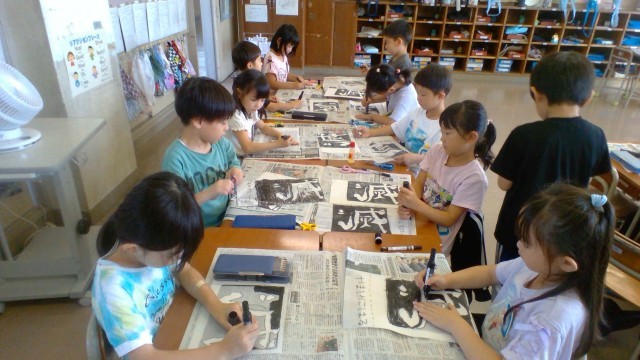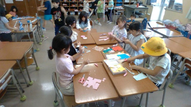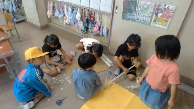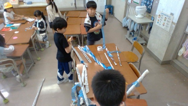 自分たちで衣装や場面に合う小道具を作成しています。登場人物や動きに合う小道具を考え、楽しそうに作っていました。