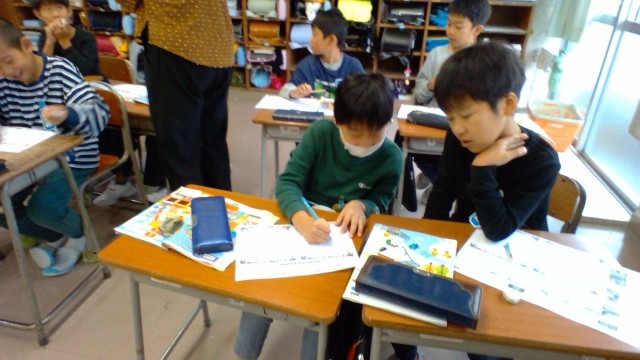 今日は、ハロウィンなので、いろいろな形を使ってモンスターの絵をかきました。