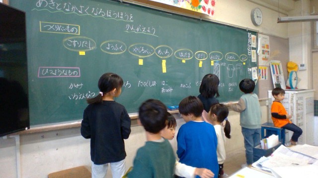 天瀬の森で見つけた秋や先生が山で集めたものを使って、どんな遊びができるか考えました。