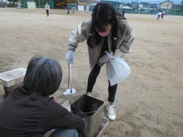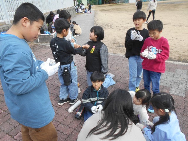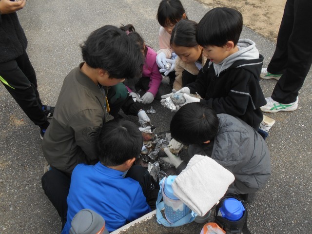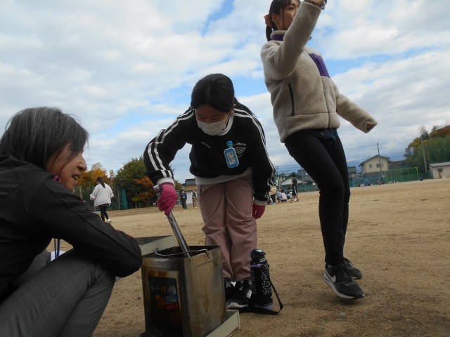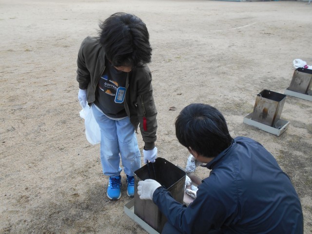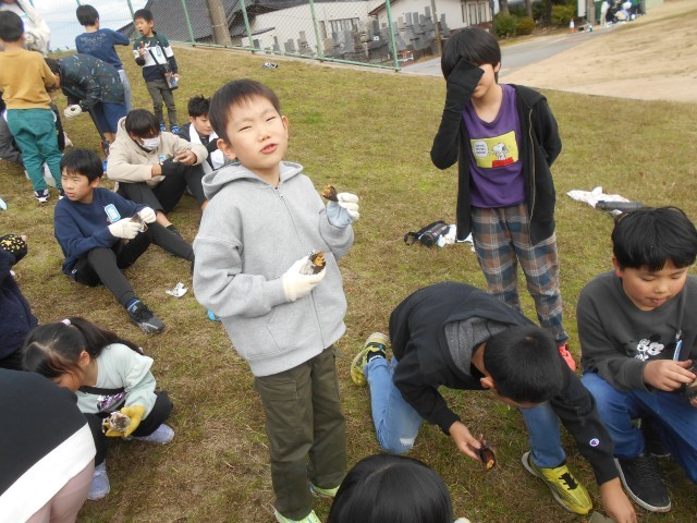 炭火で蒸し焼きにしたさつまいもを、縦割り班のリーダーが取り出しました。