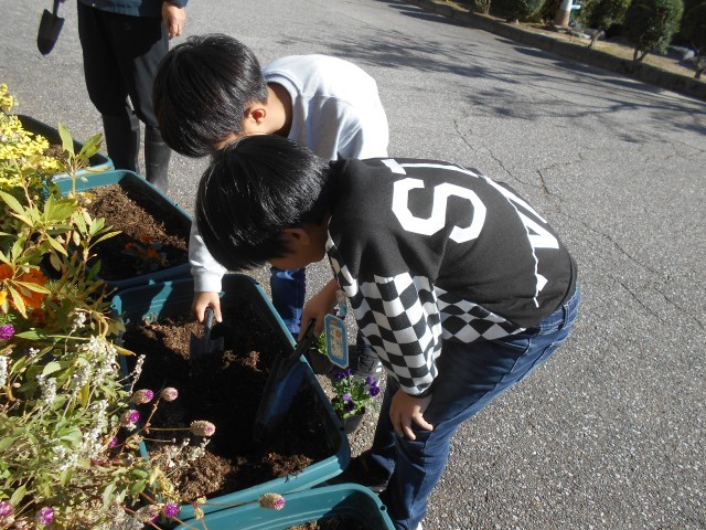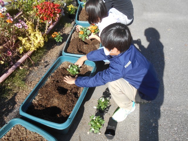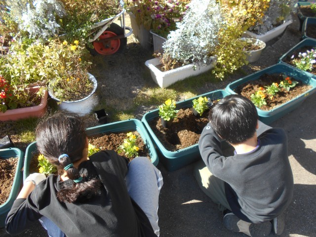 苗の色合いを子供たちにお任せしたところ、とてもセンスよく植えてくれました。