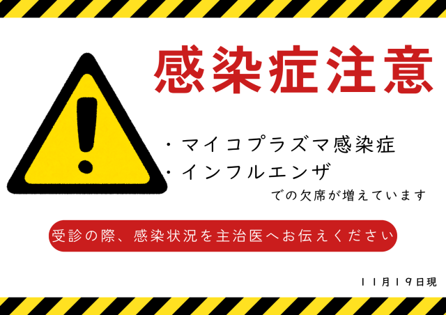 今週に入り、インフルエンザ・マイコプラズマ感染症が複数確認されています。