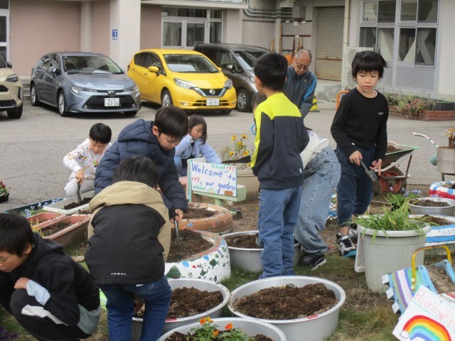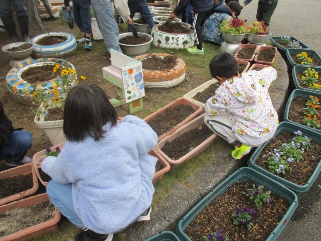 水曜日の自主活動で、自然委員会といっしょにビオラなどの花を植える子たちがいました。