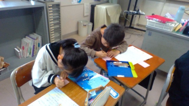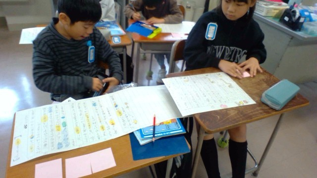 友達の書いた文章を真剣に読み、感想を伝え合っています