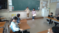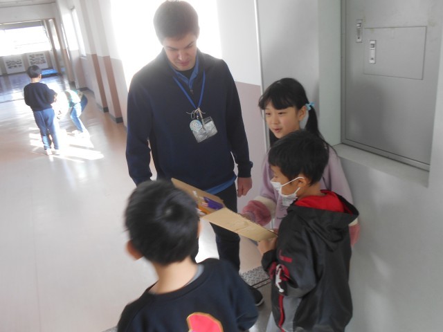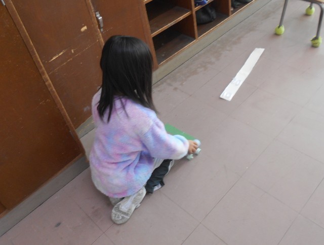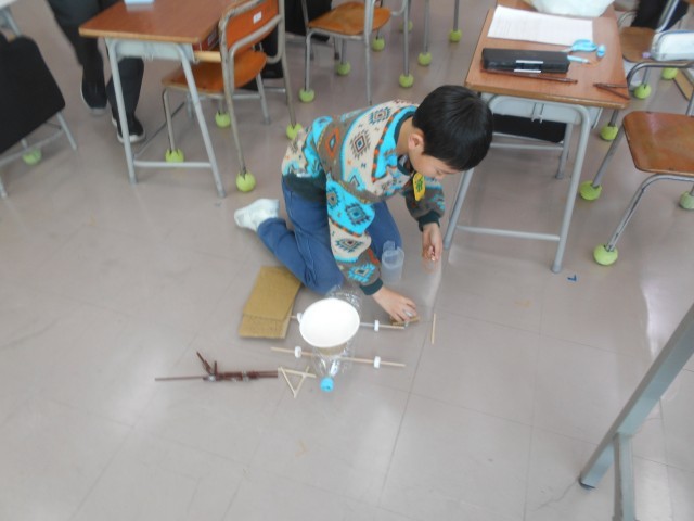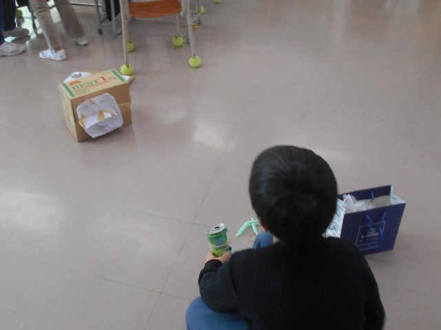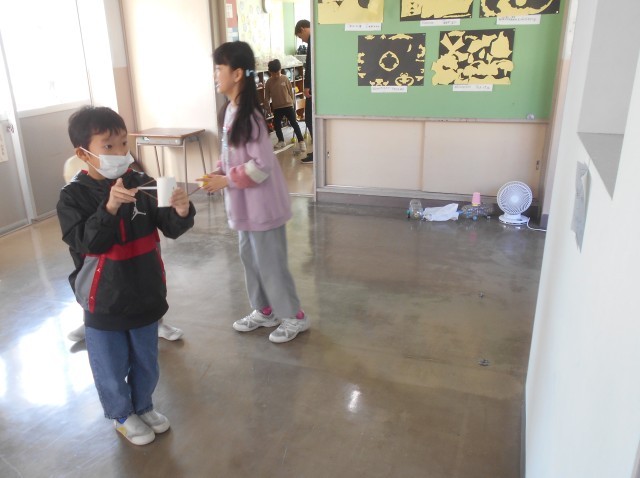 生活科の学習で、自分や仲間が作ったおもちゃを試しています。