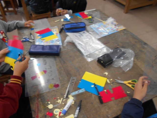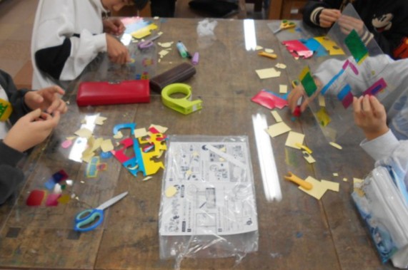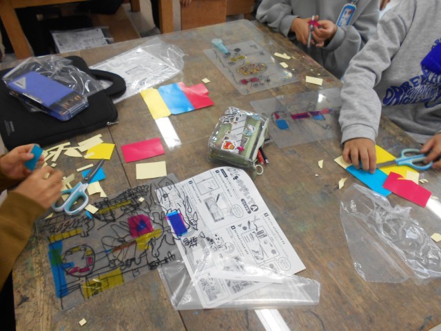 4年生の図画工作科「まどをのぞいて」では、校舎から見える景色に赤・青・黄のカラーセロハンを透明な下敷きに重ねて貼り、見慣れた風景を“自分で考えた〇〇な世界”として表しました。完成した作品は、これから下敷きとして大切に使っていきます。