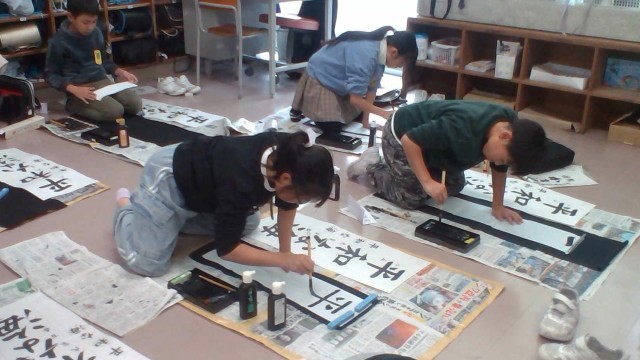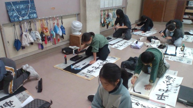 書き初めの練習をしました。お手本を見て、一生懸命に練習しています。