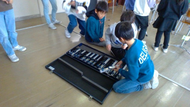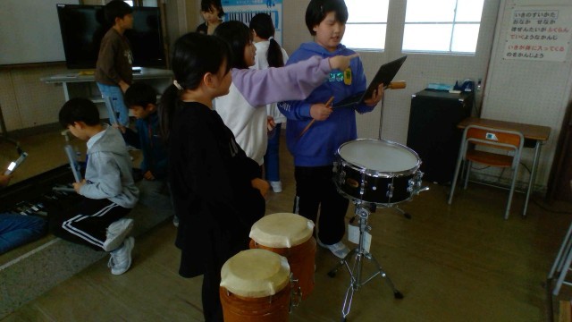 音楽科の学習では、音の特徴に注目して打楽器の音楽をつくっています。