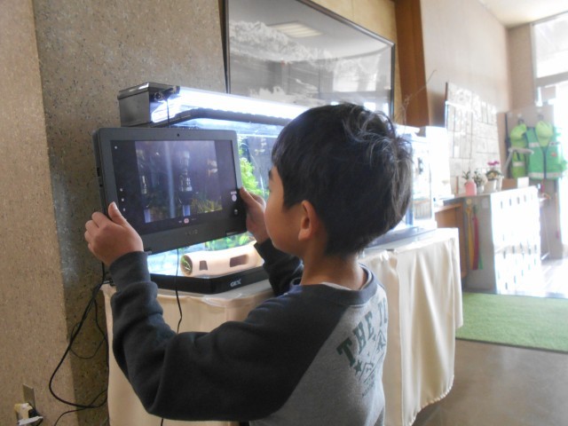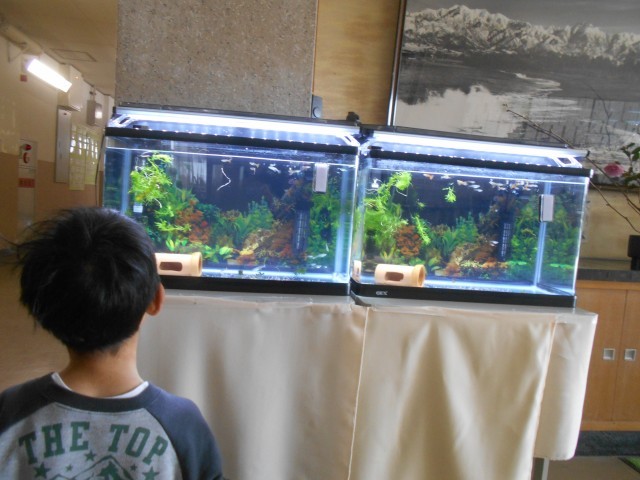早速、2年生がきれいに水槽をのぞいていたので、聞いてみると「算数の学習で身の回りにある数字を探している」とのこと。水槽がきれいになると、浄水器の数字もよく見えますね。
