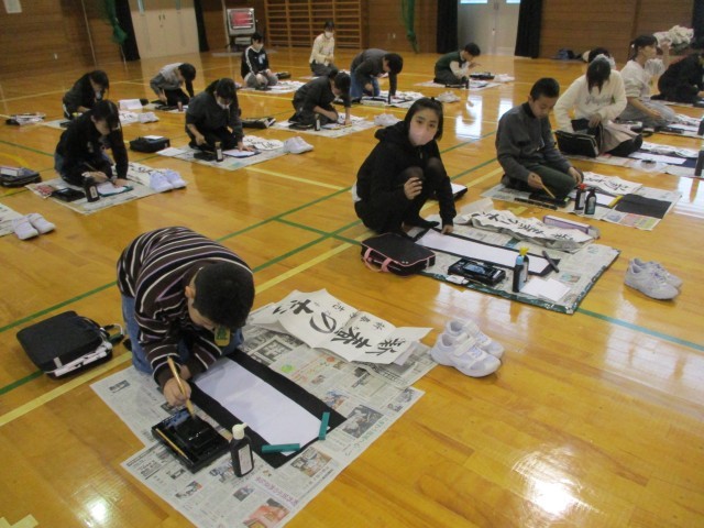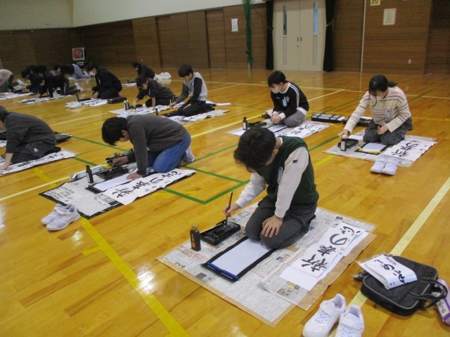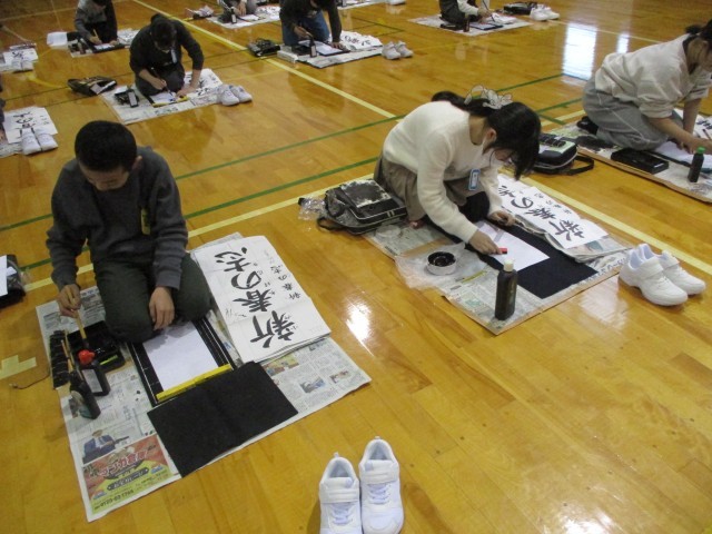 書初め大会では、集中して一筆一筆に思いを込めて筆を進める姿が見られました。