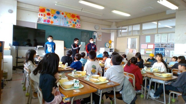 今日の給食の時間に各学年に、お知らせに行きました。1年生にとって初めての6年生を送る会なので、1年生が理解できるようにていねいに説明していました。