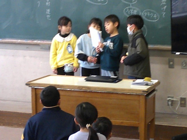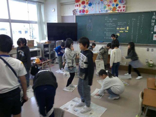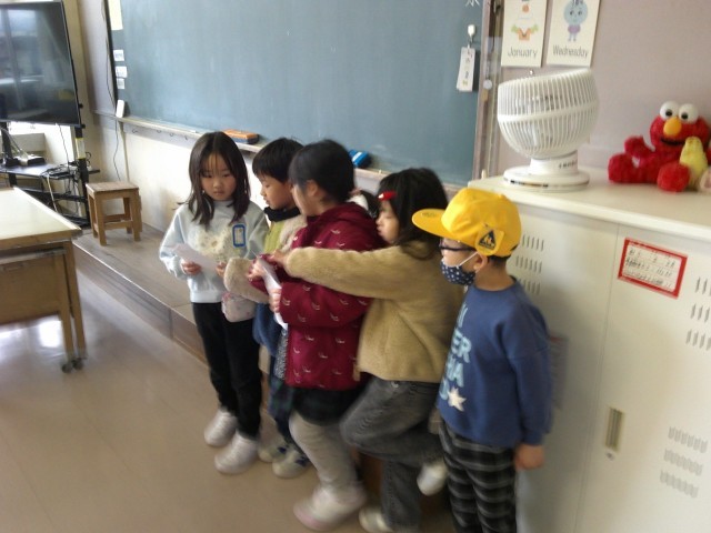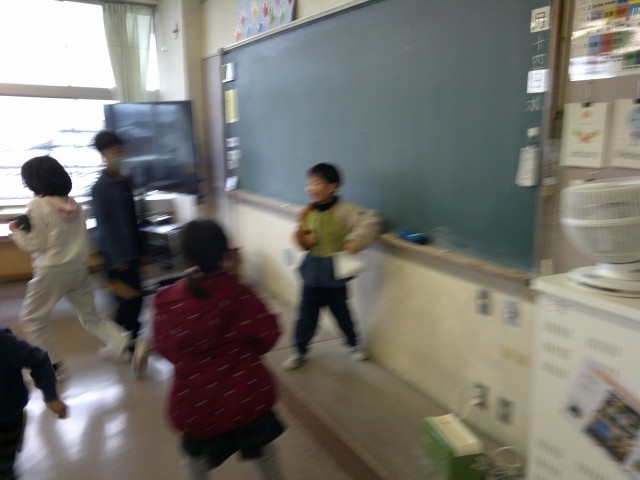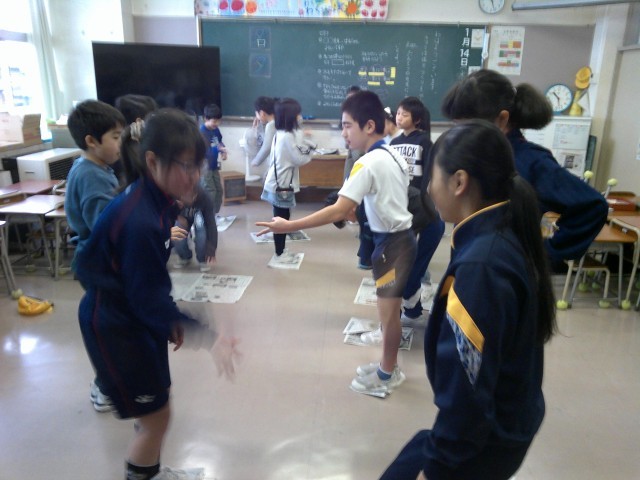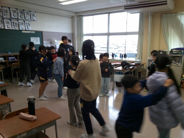 今日の体力つくりは、1年生の提案で、「じゃんけん列車」や「だるまさんが転んだ」等の活動に取り組みました。