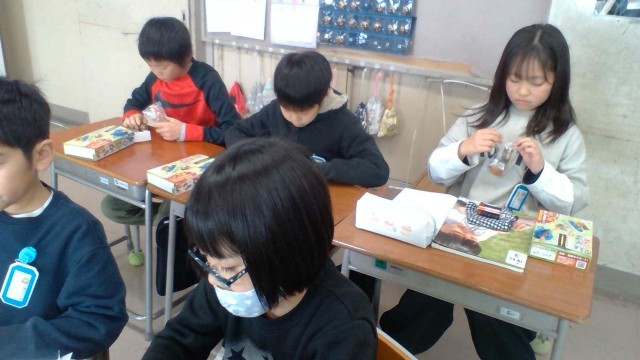 銅線をどのように電池につなげると、豆電球につくのかを調べました。