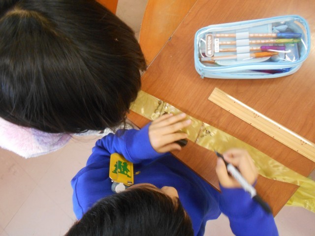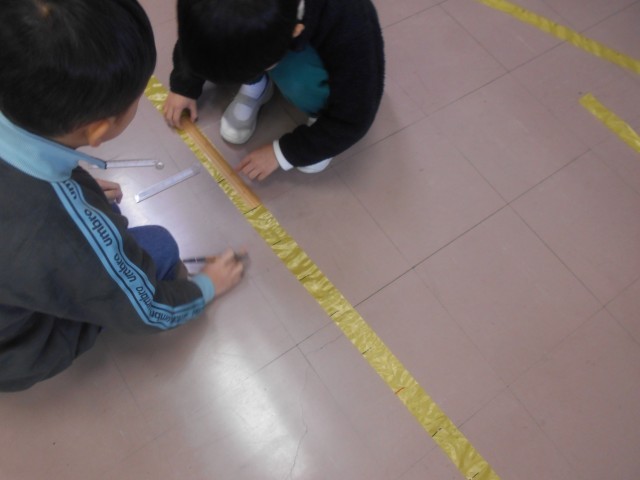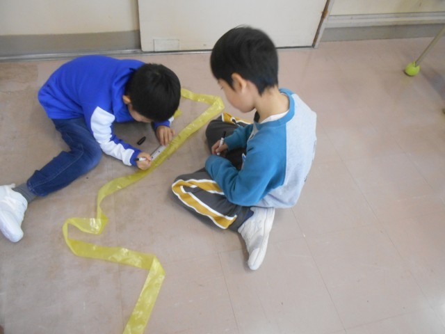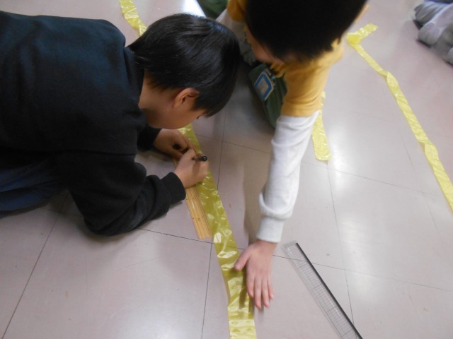 2年生教室では、算数の学習で「3mものさし」を作っていました。