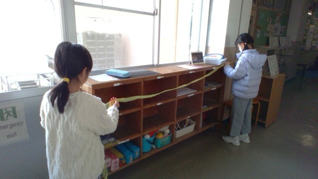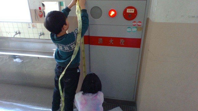 作ったテープのものさしを使って、学校のいろいろなものの長さを予想して、はかりました。