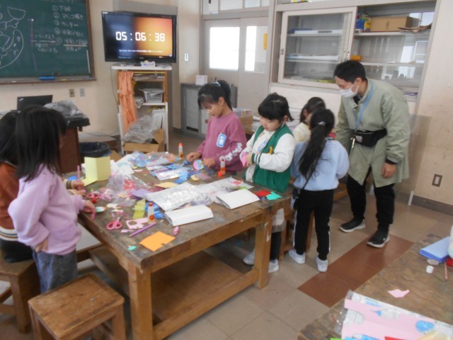 図画工作科「スルスルビューン」で、スノーボードを楽しんでいる自分を製作しています。