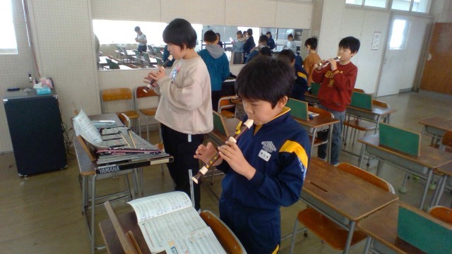 「鉄腕アトム」の器楽合奏発表に向けて練習中。
