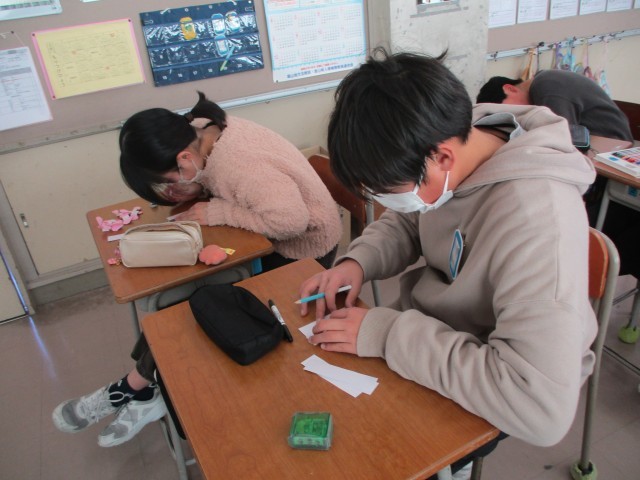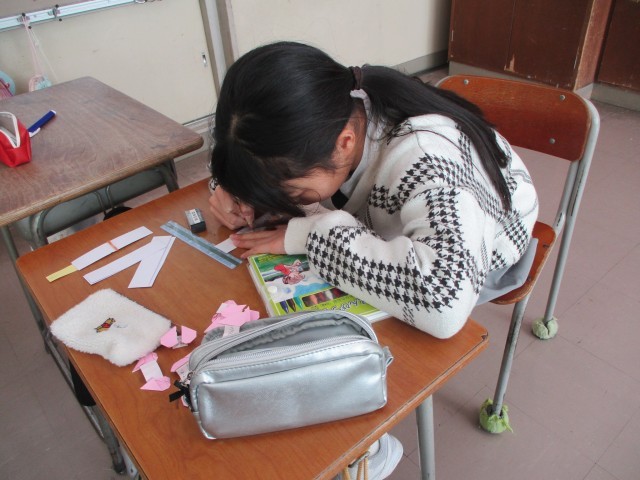 今日はピンク色の折り紙や白い画用紙を使って何かを作っています。