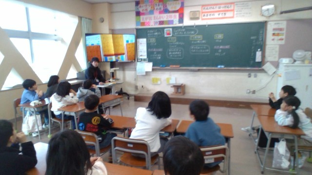 今日は、1年生教室のN先生に読み聞かせをしてもらいました。