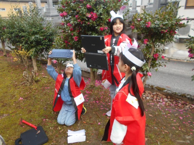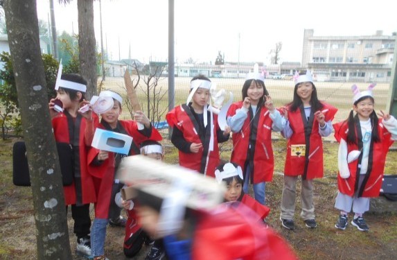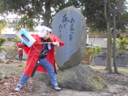 わっかで変身の学習をしました。天瀬の森で撮影会をしています。くらげに変身したり、大好きなポテトに変身したり、思い思いの工作をして変身を楽しみました。なんと、最後の写真には忍者の姿も撮影できました!