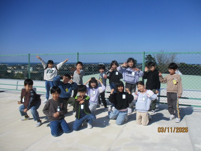 澄み切った青空の下、みんなで学級写真を撮りました。