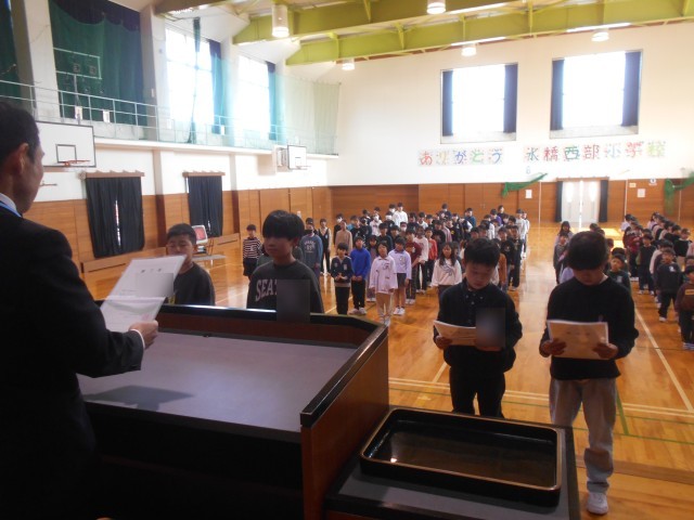 校長先生から、各学年の代表児童に修了証が手渡されました。