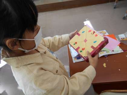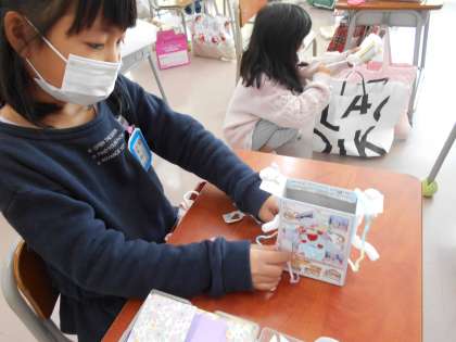図画工作科の時間です。箱に飾りを付けたり、中に収納スペースを作ったりしながら、素敵な箱になりました。友達と材料を交換したり、相談したりしながら、楽しそうに活動していました。