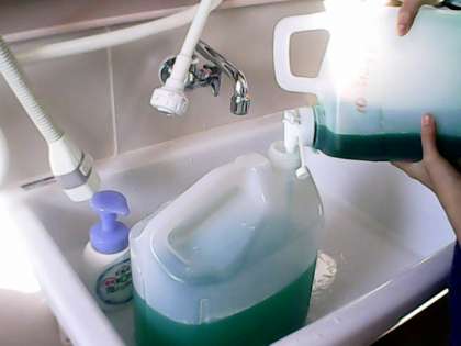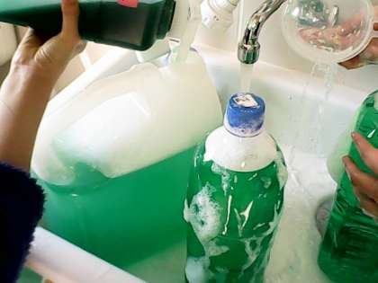 また、容器に入れている石けんは、原液から薄めて使用しています。原液の石けんを薄めて準備しているのも私たちです。そのまま使うと肌に強すぎるので、10倍に薄めています。色を見れば、だいたいの濃さが分かります!