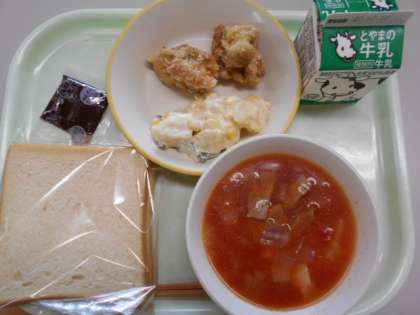 今日の献立は、食パン、牛乳、フライドチキン、ポテトサラダ、冬野菜のミネストローネ、チョコレートクリームです。明日の献立は、ご飯、牛乳、魚の梅風味蒲焼き、すいとんです。