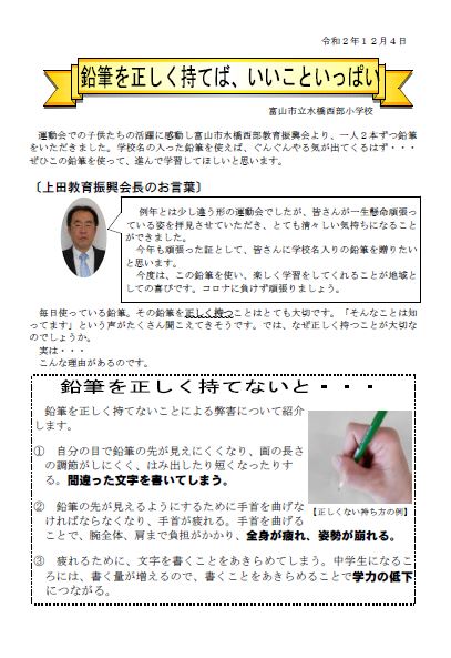 運動会でがんばった証として学校名入りの鉛筆を教育振興会からいただきました。