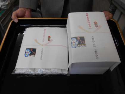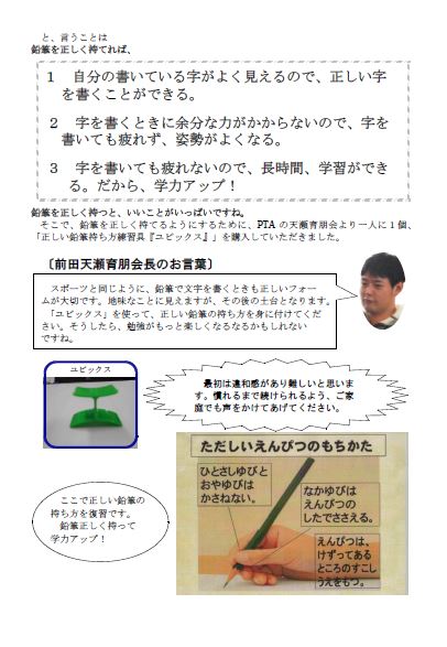 また、子供たちが正しく鉛筆を持って学習できるようにと、鉛筆の持ち方練習具(ユビックス)をPTA天瀬育朋友よりいただきました。