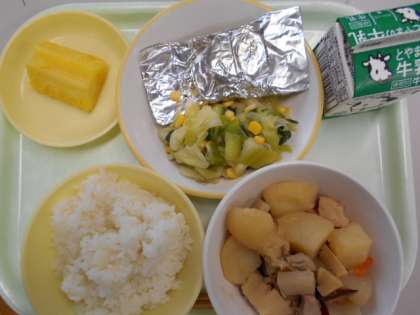今日の献立は、ご飯、牛乳、鯖の銀紙焼き、チンゲンサイソテー、大和煮、カットパインです。明日の献立は、ご飯、牛乳、焼き餃子、塩ナムル、卵とじ、シラスの佃煮です。