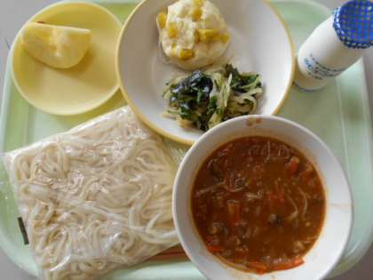 今日の献立は、ソフト麺、飲むヨーグルト、蒸しパン、大根サラダ、きのこビーフソース、リンゴです。来週月曜日の献立は、牛乳、カレーライス(麦ご飯)ゆで卵、フルーツヨーグルト、カラフルサラダです。