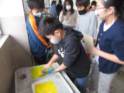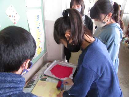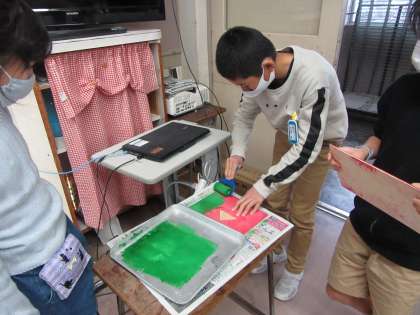 今日は、彫り進み版画の2回目でした。1回目で要領をつかみ、たくさん刷っていました。あえてずらして刷ったり、ムラをつくるために刷り方を工夫したりと様々な表現を楽しんでいました。